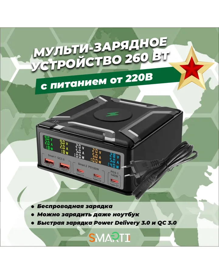 4Сетевое зарядное устройство SmartiNext для телефона и гаджетов 110ВтНа вид выглядит очень дешево, пока работает.