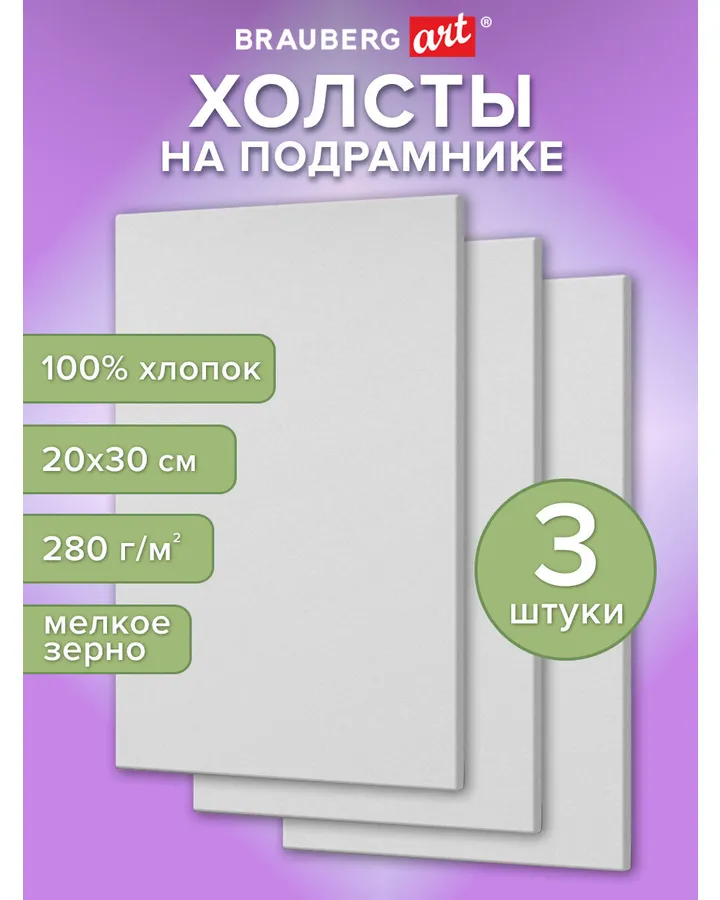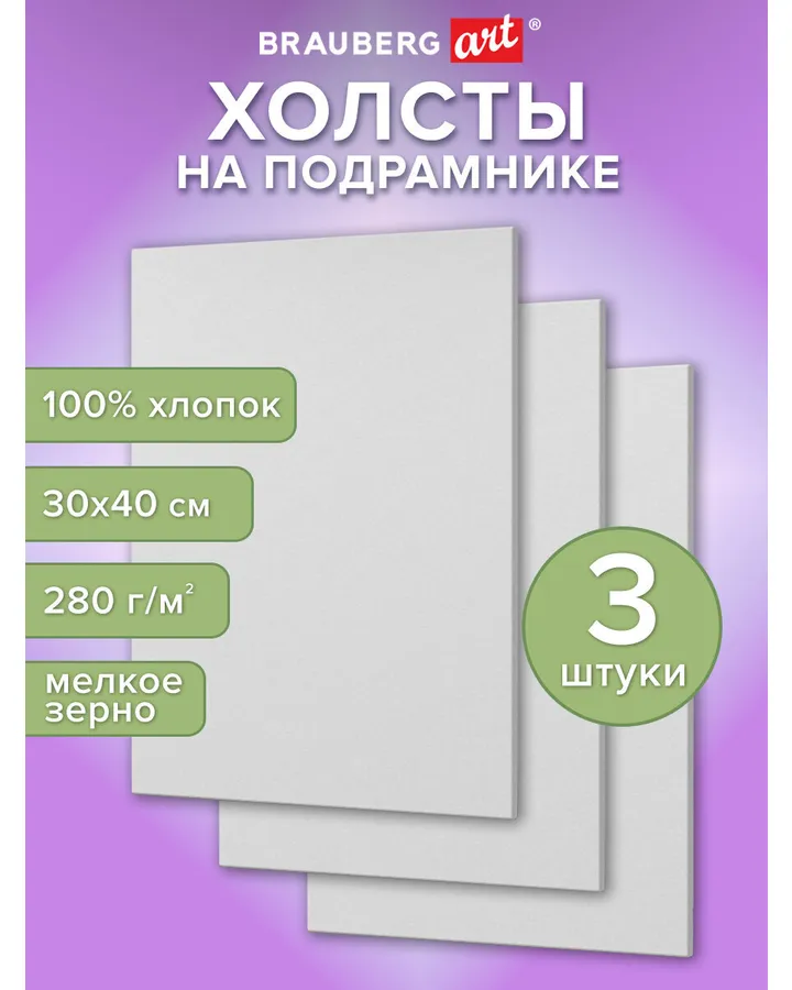 Холст для рисования Brauberg на подрамнике 30х40 см грунтованный 100% хлопок набор 3 штуки