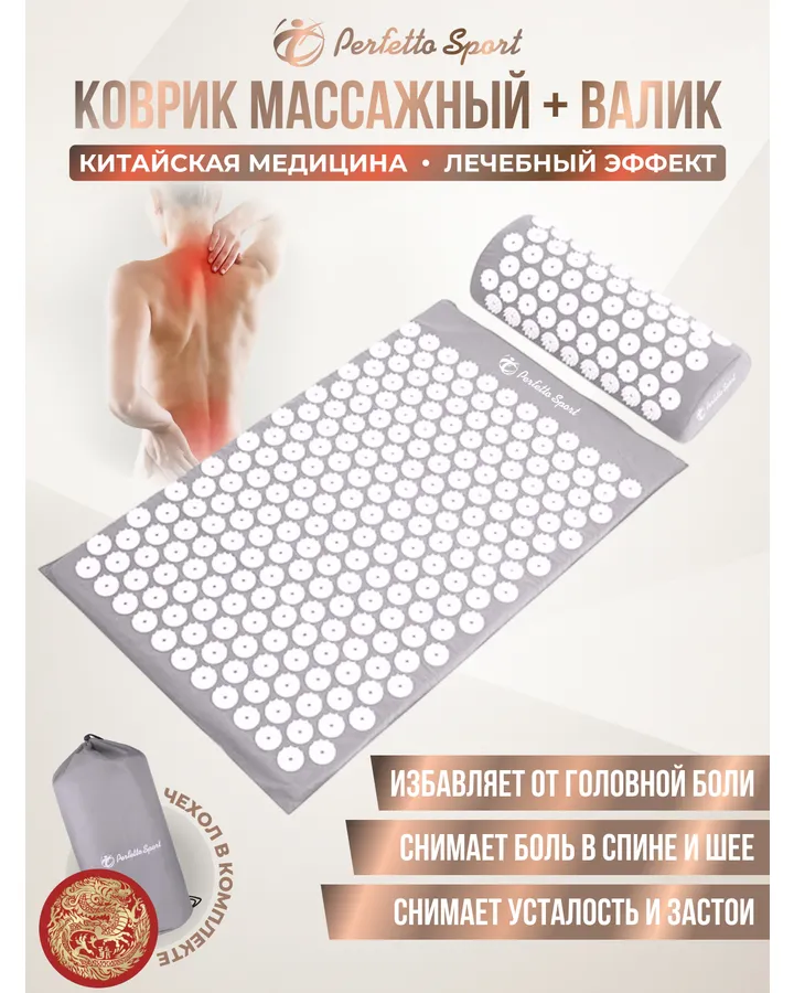 5Коврик Perfetto Sport массажный акупунктурный с валиком PS-835Расслабляет мышцы на ура и убирает спазмы, всем советую! Топ за свои деньги, и мешочек удобный, куда можно всё сложить и брать с собой в случае поездок