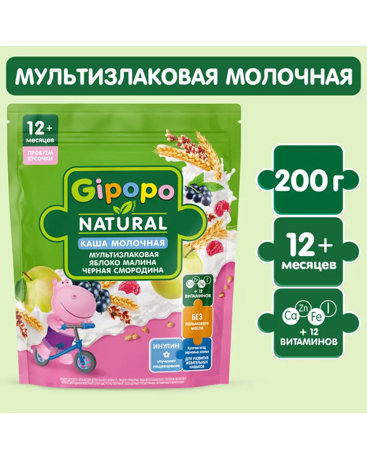 Каша Gipopo молочная мультизлаковая яблоко-малина-черная смородина 200г с 12 месяцев