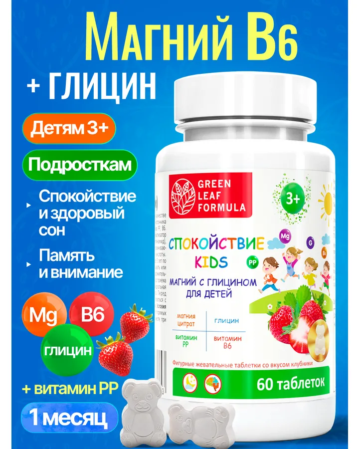 Магний В6 с глицином для детей от 3 лет Green Leaf Formula от стресса для нервной системы для памяти внимания вкус клубника
