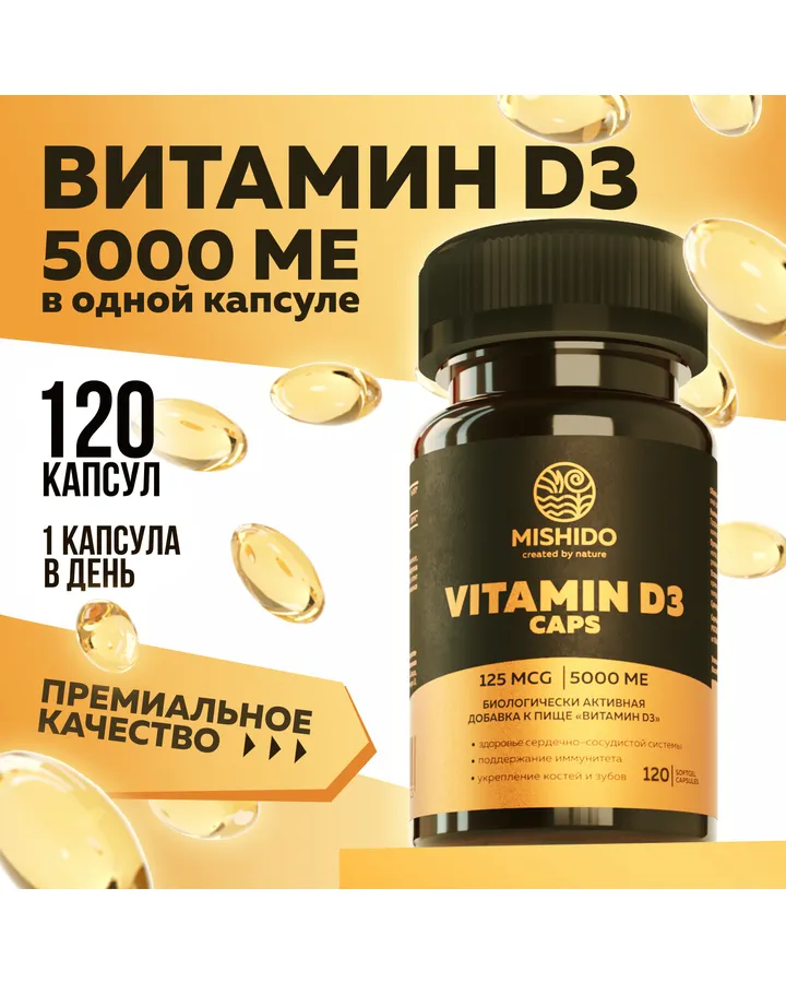 БАД к пище MISHIDO Витамин D3 холекальциферол 5000 МЕ массой 260мг 120 капсул