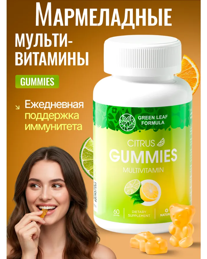 Мультивитамины для взрослых мармеладные Green Leaf Formula со вкусом цитруса для иммунитета для тонизирования для энергии и выносливости