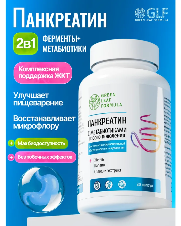 Панкреатин с метабиотиками Green Leaf Formula ферменты для пищеварения для микрофлоры кишечника