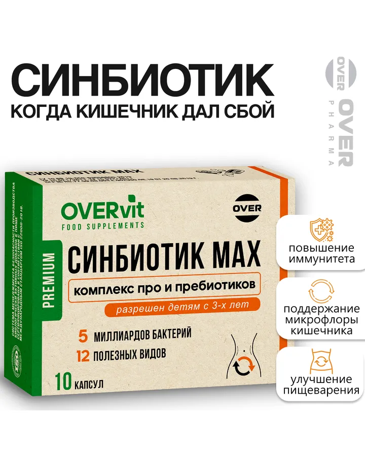 Синбиотик пробиотик и пребиотик OVER БАД для восстановления микрофлоры кишечника 10 капсул