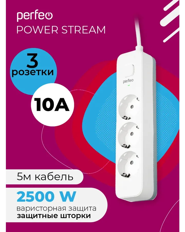Сетевой фильтр Perfeo POWER STREAM 2500W 3.0 м 3 розетки черныйОтличный фильтр,работает бесперебойно,без нареканий. Выполнен из хорошего пластика