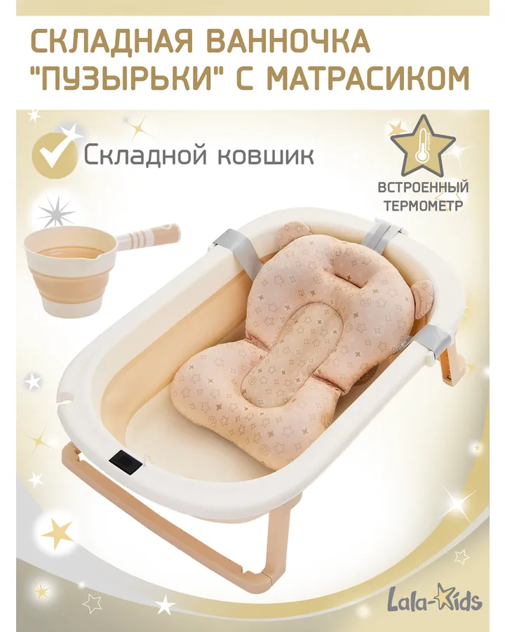 Ванночка LaLa-Kids Гамак бежевый + ковш с матрасиком, складная бежевый