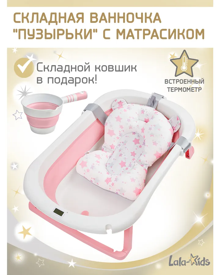 5Ванночка LaLa-Kids с матрасиком, складная серыйОтличная ванночка, без дефектов. Термометр показывает правильную температуру. Думала булет поменьше
