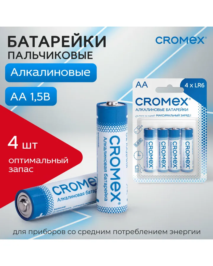 5Батарейки CROMEX пальчиковые AA алкалиновые набор 4 штуки для весов часов фонарикаБатарейки отлично работают, хватает надолго!