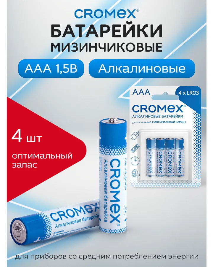 5Батарейки CROMEX мизинчиковые AAA алкалиновые набор 4 штуки для весов часов фонарикаХорошие батарейки, долго служат!