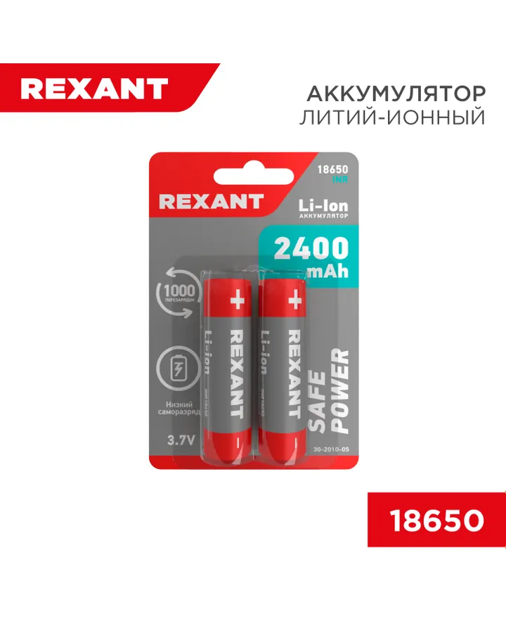 Литий-ионный аккумулятор REXANT 2400 мАч типоразмер 18650 2 шт