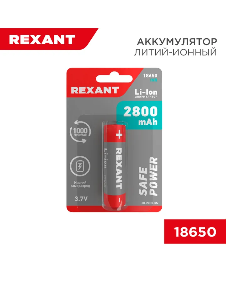 Литий-ионный аккумулятор REXANT с защитой 2800 мАч типоразмер 18650