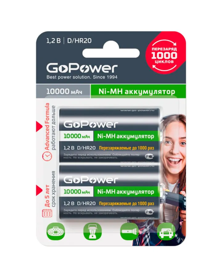 Аккумуляторные батарейки GoPower HR20 D BL2 NI-MH 10000mAh