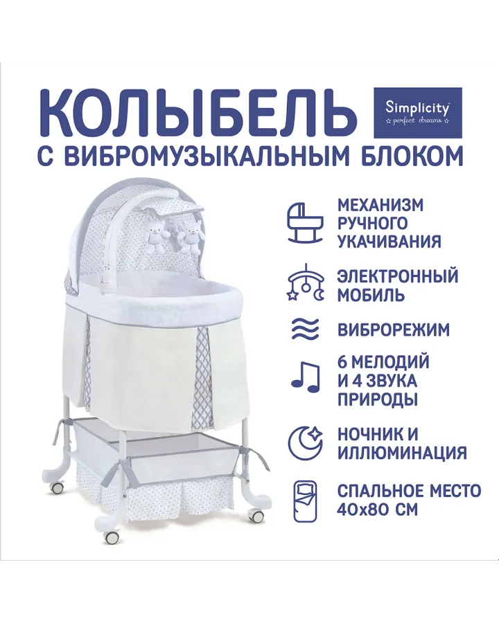 Колыбель SIMPLICITY AutoОтличная колыбель, жаль нет размера побольше)Пришла хорошо упакована , полный комплект. Очень долго выбирала и изучила много моделей, в этой колыбели собрано все что мне нужно: автоукачивание мягкое и бесшумное, мягкие колесики, капор с игрушками, музыка , подсветка, очень приятные материалы, корзина для игрушек, пеленок и т.д. Передвигаем по всему дому, хватит думаю месяцев до 5-6 .