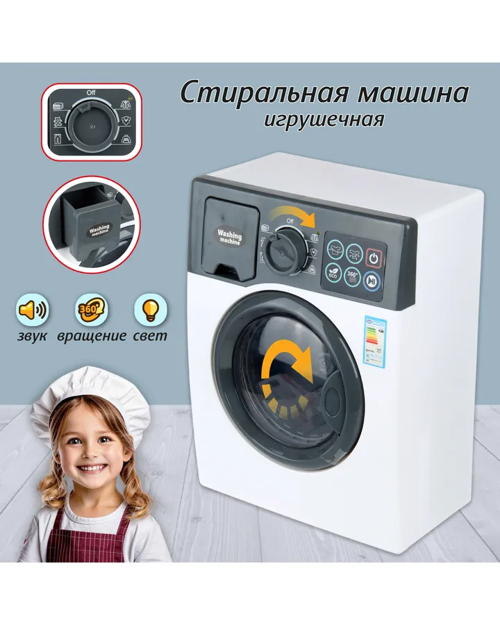 Игрушка . стиральная машина в ассортиментеКлассная машинка, не маленькая. В машинке светится барабан без остановки. Также нажимаешь на кнопку крутится барабан.