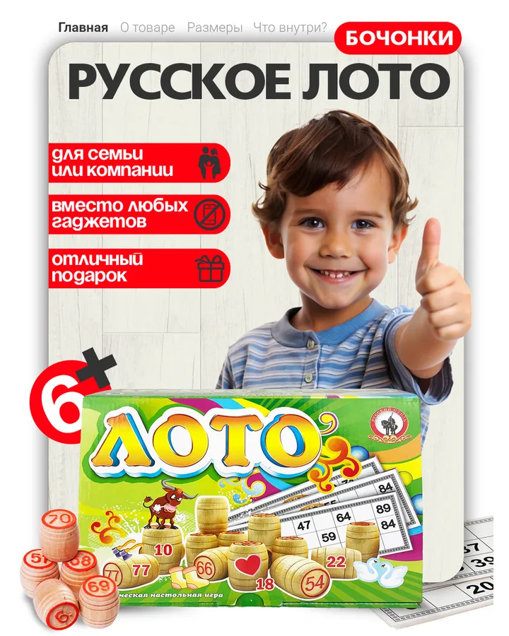 5Настольная игра Русский стиль ЛотоКоробочка пришла чуть помятая, бочонки все на месте +1 запасной. Покупала для счёта, изучаем цифры.