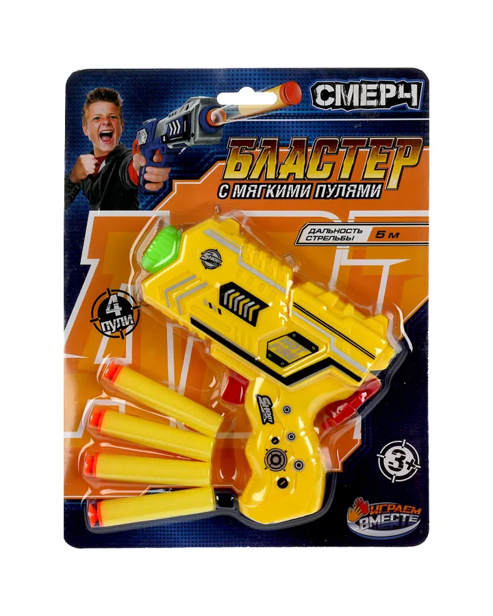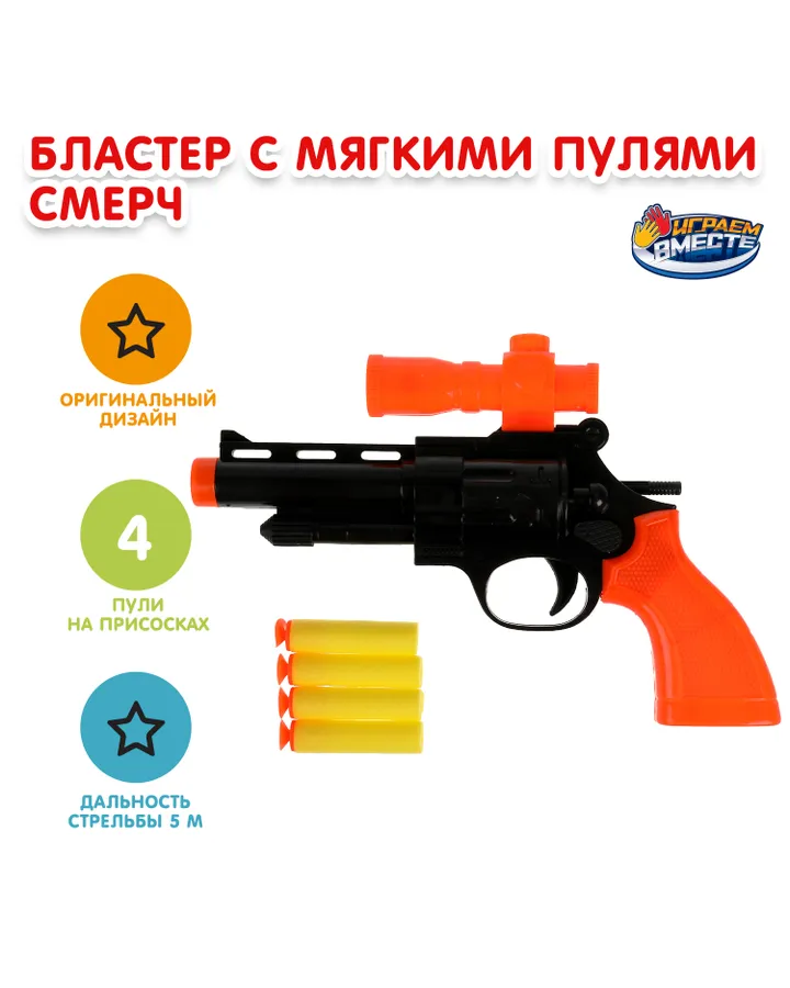 Бластер Играем вместеПистолет отлично подходит для веселых игр в компании друзей. Он легко заряжается и стреляет точно, что делает игру более динамичной. Материалы качественные и безопасные, что важно для родителей. В целом, это отличный аксессуар для активных развлечений и развития воображения у детей.