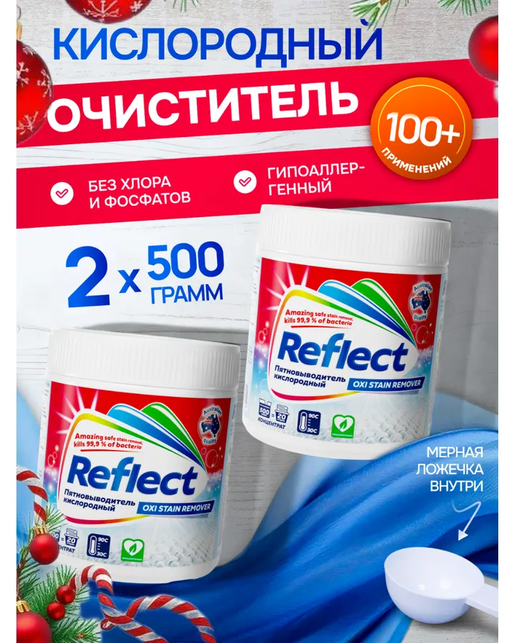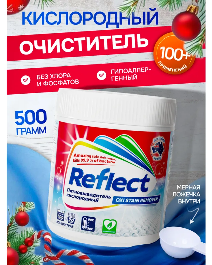 5Пятновыводитель Reflect OXI stain Remover 0.9 кгОтбеливатель отличного качества. Со своей работой справляется хорошо. Спасибо. Доставка быстрая, всё целое. Упаковка отличная.