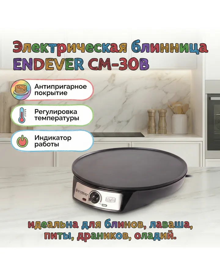 Электрическая блинница ENDEVER CM-30BОтличная блинница, все пропекает равномерно. Теперь пеку блины под сериальчик с удовольствием.после этой блинницы попробовала испечь блины на обычной плите, уже совсем не, на вкус блины отличаются. Дети сравнили блины испеченные на обычной плите и блиннице. На блиннице сказали конечно вкуснее