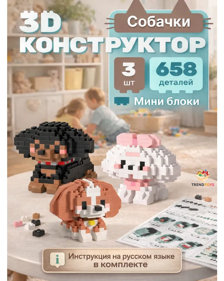Набор состоит из 3 пакетиков, на каждую собачку свой. Инструкция очень подробная и понятная. Собачки разные, интересно собрать и потом ими же играть