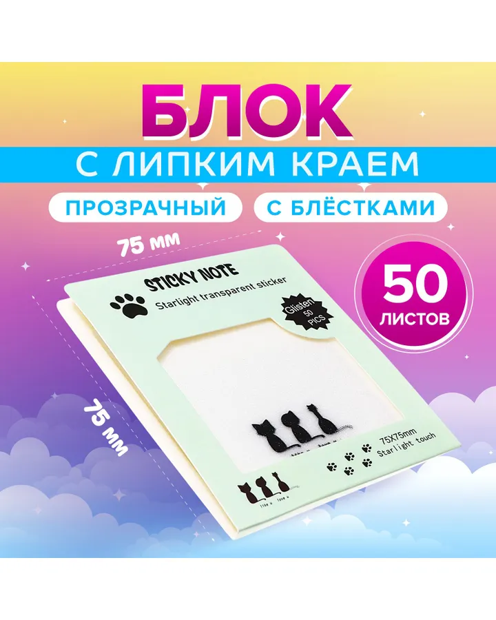 Блок для записей Calligrata с липким краем 75мм х 75мм 50л пластик прозрачные