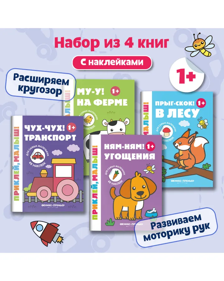 Набор из 4 книг Феникс Премьер Приклей малыш! Угощения. В лесу. На ферме. Транспорт