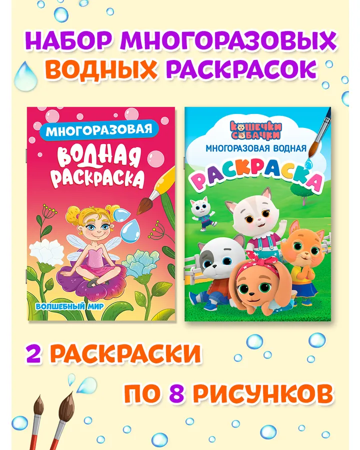 Многоразовая раскраска Проф-Пресс водная. 2 шт. Кошечки собачки+Волшебный мир. 16х23 см