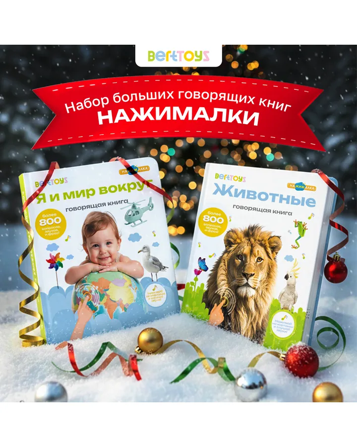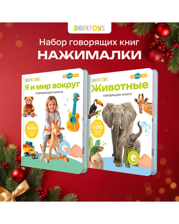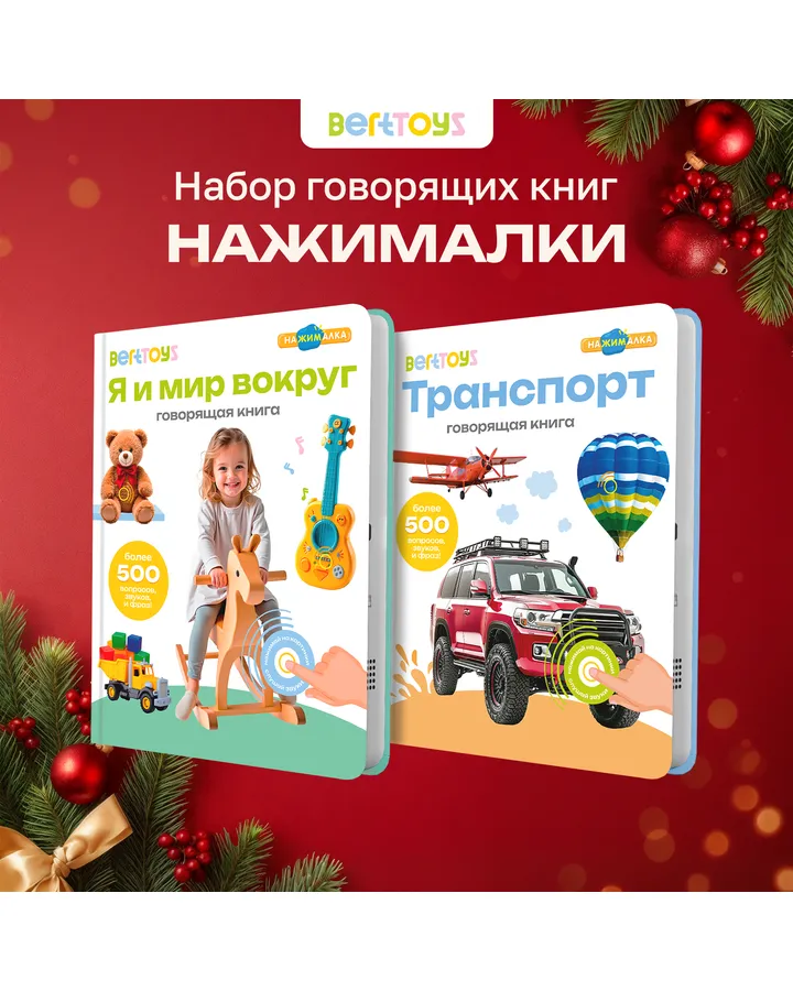 Комплект говорящих книжек BertToys Нажималки: Я и Мир Вокруг + ТранспортКниги очень классные! Ребенку 2 года, с удовольствием изучает. Качество страниц хорошее , звук тоже. Нравится, что есть не просто названия и факты, но и всякие игры-викторины с вопросами ребенку