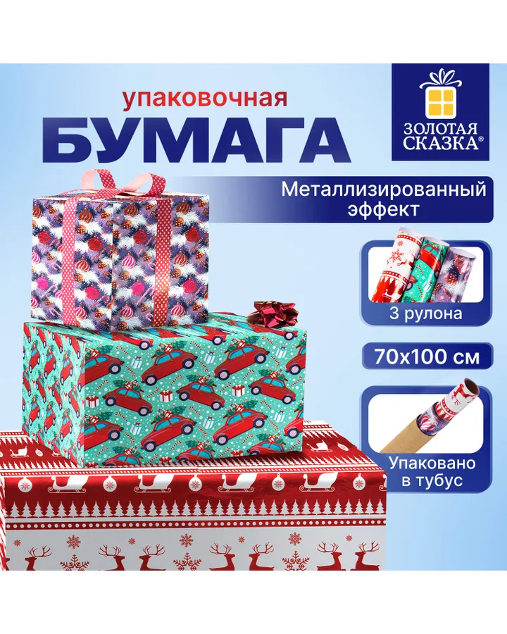 Упаковочная бумага Золотая сказка для подарков рулон 70x100 см набор 3 штуки