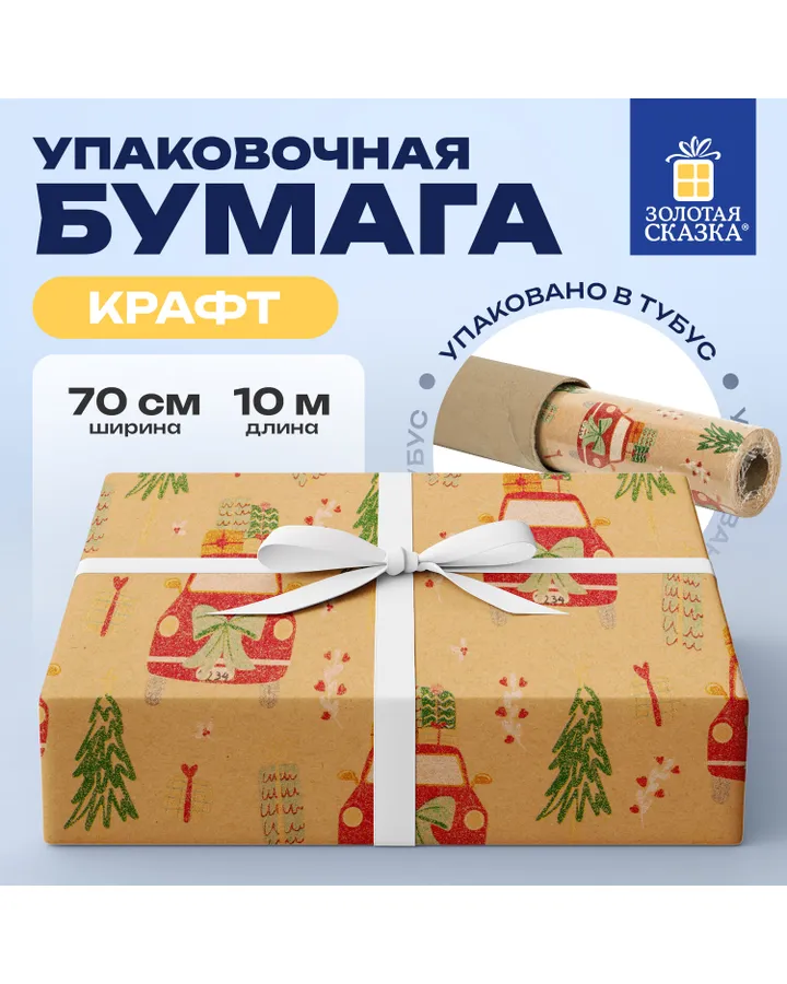 Упаковочная бумага Золотая сказка для новогодних подарков крафт рулон 0,7х10 м xmas Car