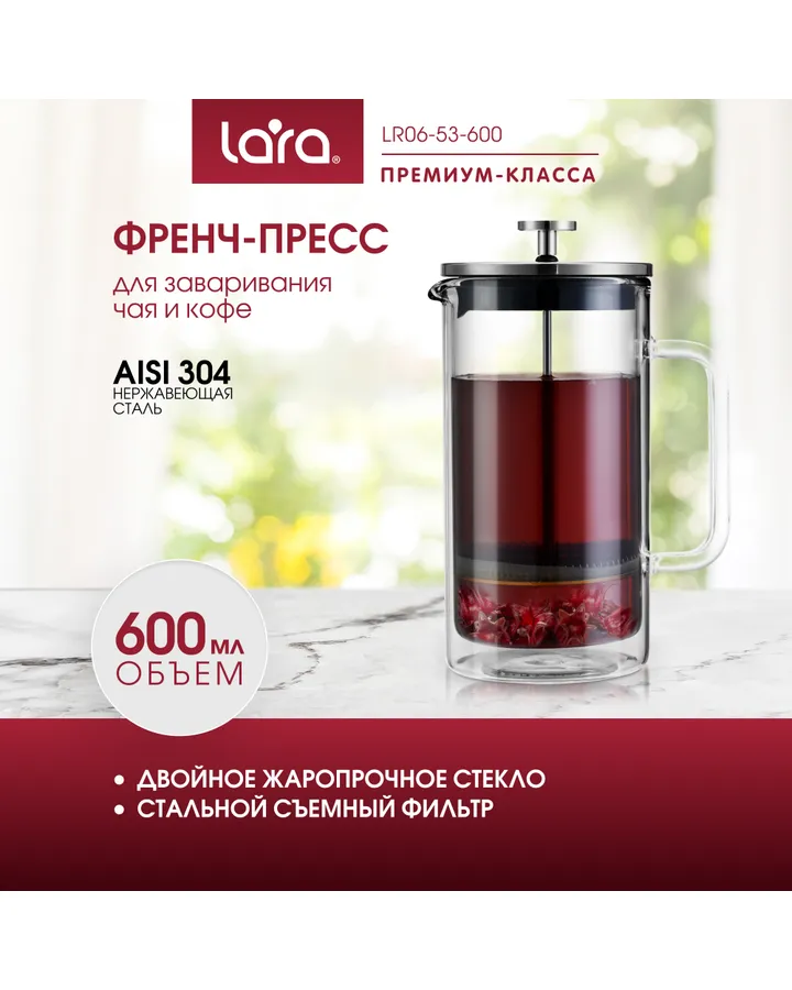 Френч-пресс LARA LR06-53-600 нержавеющая сталь жаропрочное боросиликатное стекло