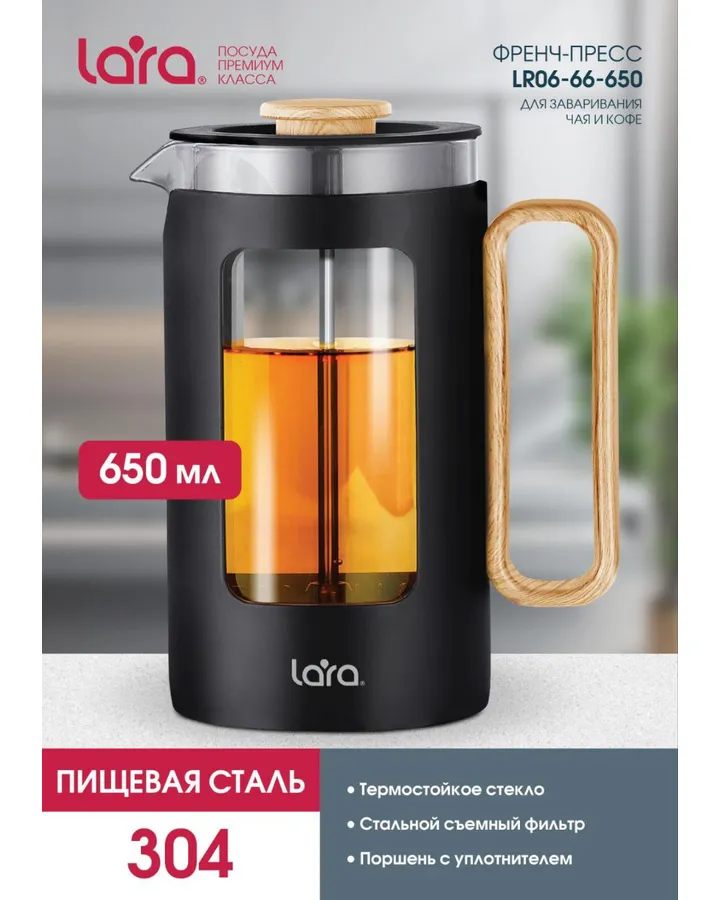 Френч-пресс LARA LR06-54-600 черный 600 мл жаропрочное боросиликатное стекло