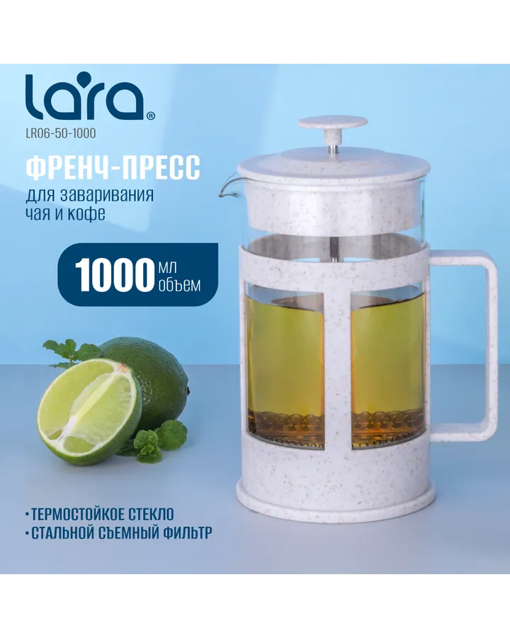 Френч-пресс LARA LR06-50-1000 бежевый 1 л эко материал волокно пшеничной соломы