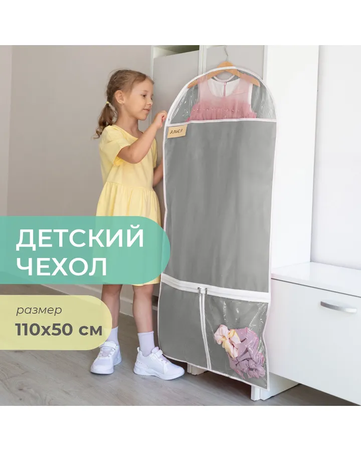 Чехол для одежды Всё на местах Детский на молнии длинный с карманами серый