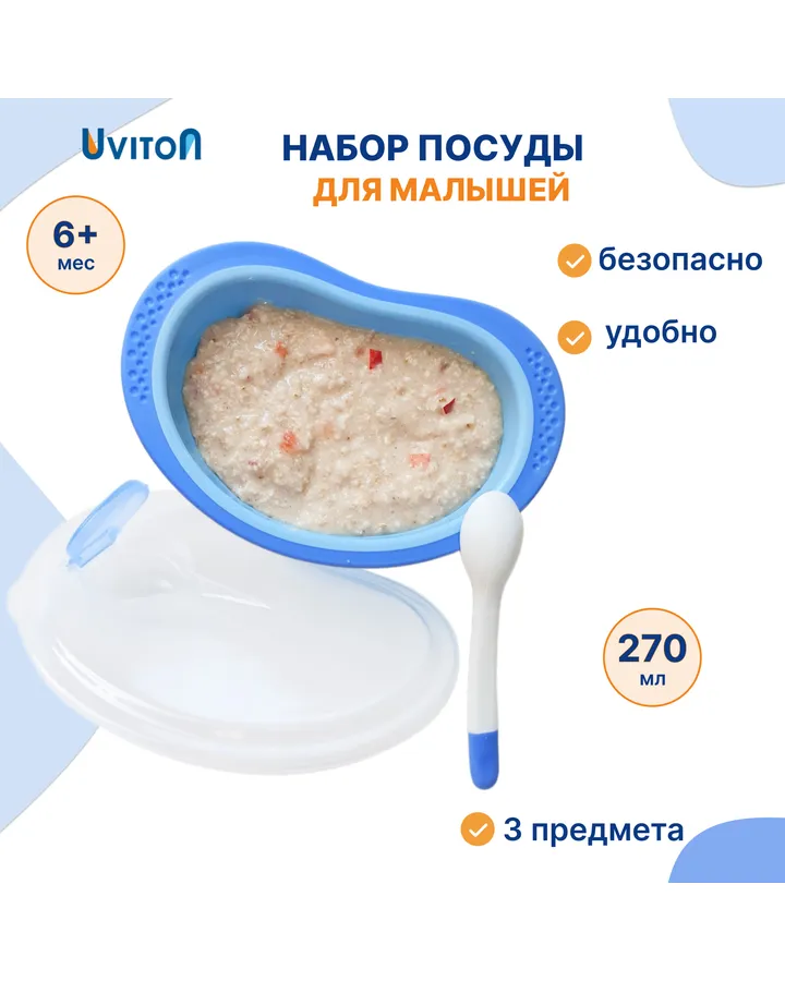 Тарелка Uviton тарелочка детская 270 мл 3 предм.Очень удобная тарелочка, особенно в поездках. Также используем при ежедневных кормлениях дома, только ложку используем другую. (В наборе не очень удобная)