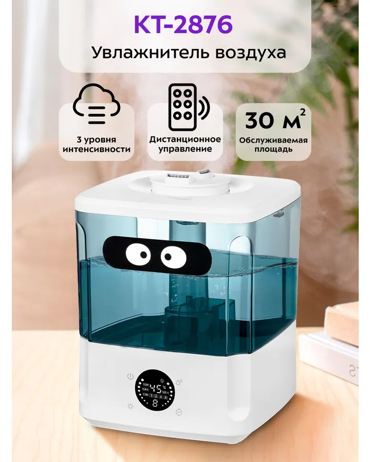 Увлажнитель воздуха KITFORT КТ-2876Отличный увлажнитель воздуха. Абсолютно бесшумный. Достаточно вместительный резервуар для воды,которую удобно заливать. Приятная подсветка,и очень милые глАзки)) Ребёнок доволен,а это самое главное!)