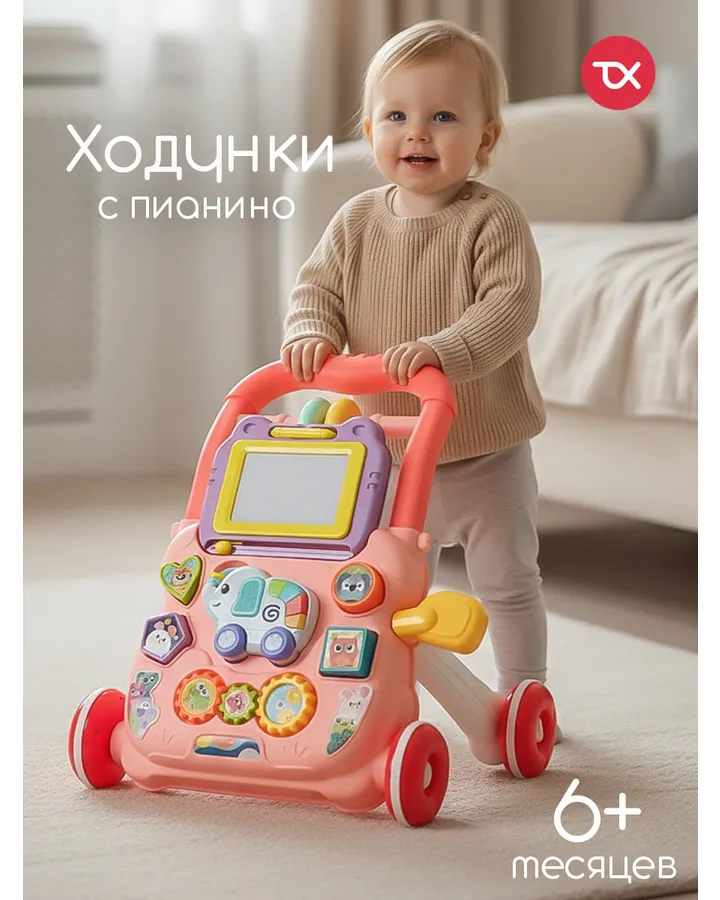 Хорошие ходунки! Очень компактные, легко складываются и собираются за 5 минут. Регулировка удобная. Игрушки на панели закреплены надежно — дочка пыталась вытащить зайца, но безуспешно. Для 7 месяцев то, что нужно.
