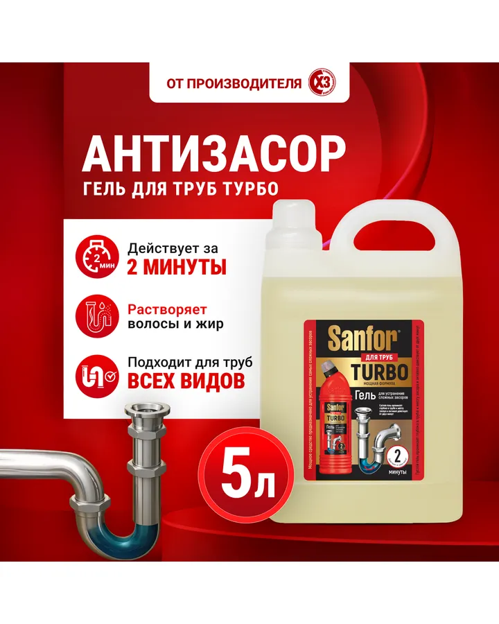 Средство против засоров Sanfor гель для труб Turbo - 5 л