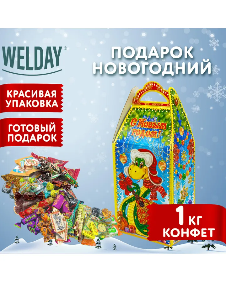Сладкий новогодний подарок WELDAY для детей символ 2025 набор конфет в мягкой игрушке ЗеленоглазкаКлассная игрушка, много разных конфет. Дети довольны)