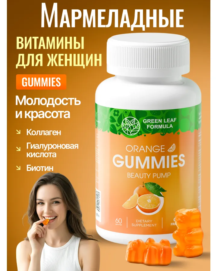 Мармеладные витамины для женщин Green Leaf Formula пастилки со вкусом апельсина с коллагеном и гиалуроновой кислотой для красотыволосы быстрее растут, особенно челка