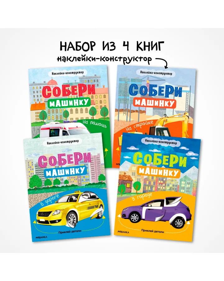 Набор книг МОЗАИКА kids Собери машинку. 4 книги с наклейками