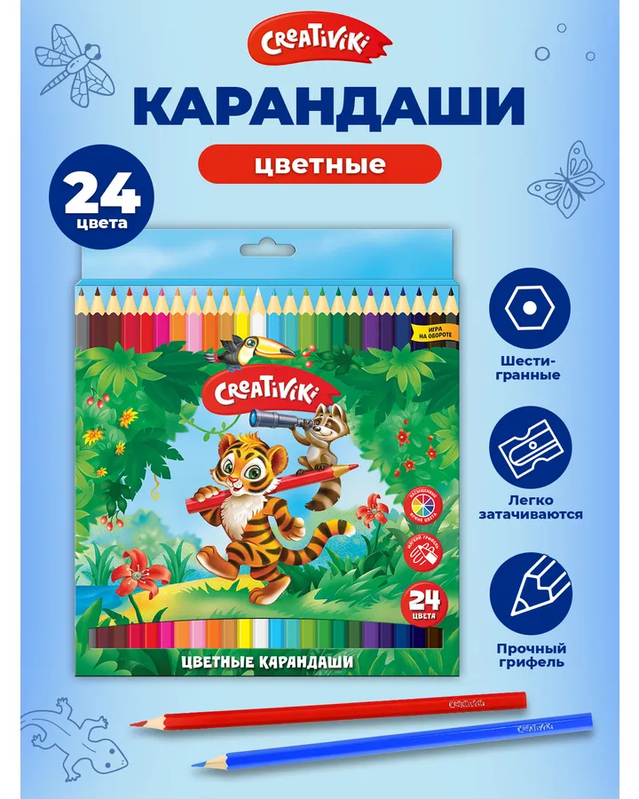 4Карандаши цветные CReATiViKi 24 шт.Цвета карандашей хорошие, но очень жёсткие, маленькие дети рисовать не смогут!!!