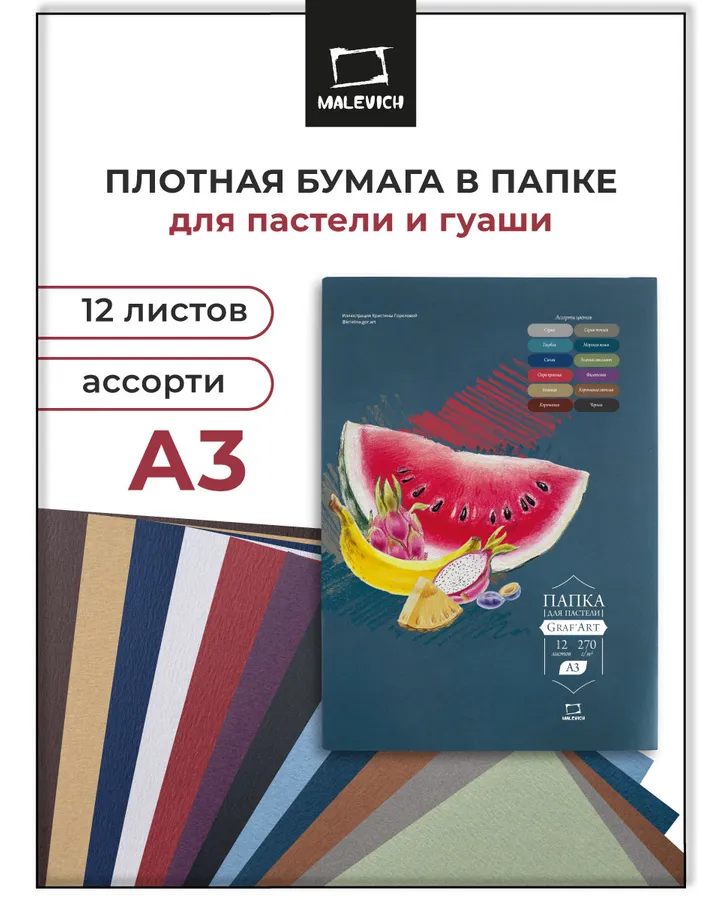 Художественная бумага, цветной картон, цветная бумага, папка для рисования Малевичъ 12 лист.