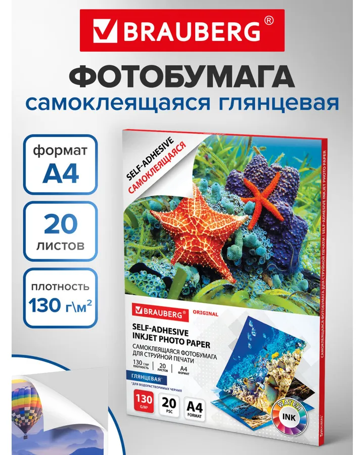 Фотобумага Brauberg глянцевая для печати фото самоклеящаяся 20 листов А4