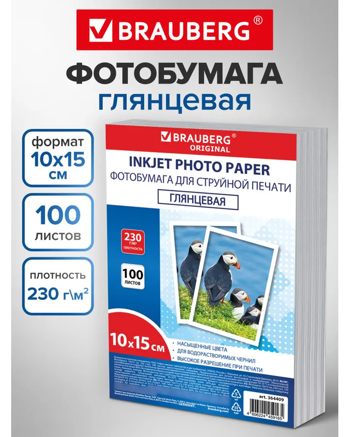5Фотобумага Brauberg глянцевая для печати фото 50 листов 10x15 смОтличная бумага для фото! Цвета яркие и насыщенные.