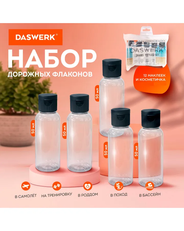 Дорожный набор флаконов DASWERK 5 штук 50 мл баночки для путешествийУдобные но с хлипкими крышками. На 1 раз подойдёт отлично.