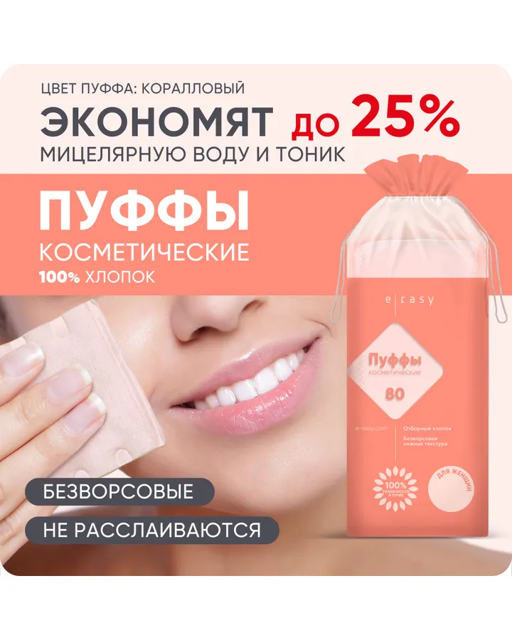 5Ватные диски E-RASY 222 шт.Сохраняют свою форму и не расслаиваются, что делает процесс демакияжа или нанесения косметики очень удобным.