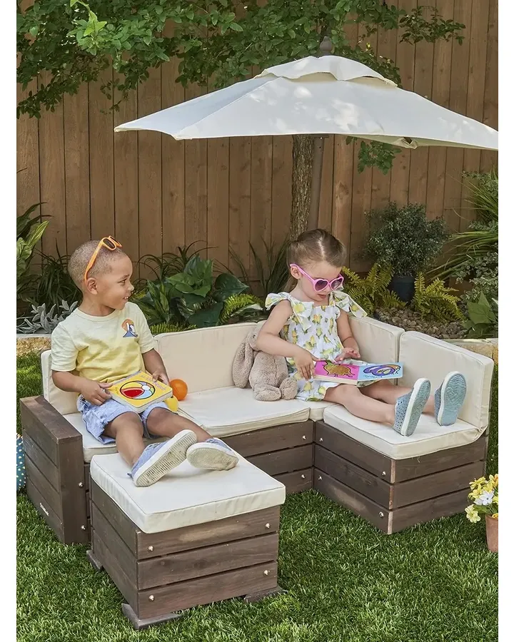 Набор садовой мебели для детей KidKraft секционный диван пуф-стол зонт бежево-коричневый 20305_KEКлассный диванчик на улицу! Мягкая подкладка придает ему удобство, а дерево, из которого он сделан очень качественное. Навес придаёт дивану стиль и элегантность.