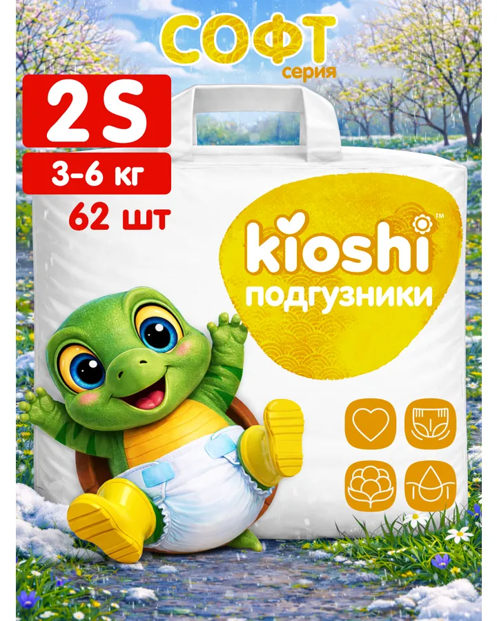 Подгузники Kioshi S 62 шт.Активно пользуюсь. Подгузники мягкие, объемнее и шире хагисов того же номера. С одной стороны, требуется запас в размере одежды, а с другой - какашки сразу не вытекают. Хагисы впитывают не хуже, но не остается "кармана" для вонючего содержимого.