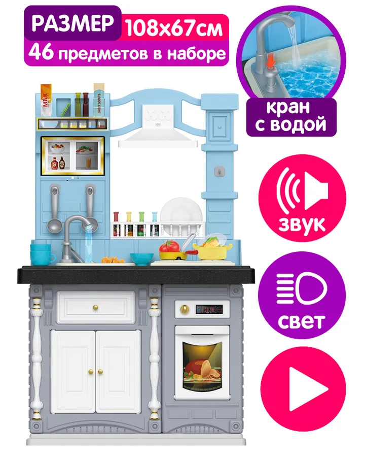 Кухня отпадная, ребенок в восторге Долго не знали как угодить дочке, но от кухне она была без ума. Игрушка внушительных размер, с большой комплектацией посуды, кран с настоящей водой и звуковой духовкой. Все шкафчики открываются, ручки у плиты крутятся. Над раковиной находиться доска, рисовать на ней специальной ручкой в виде морковки. Набор очень довольны